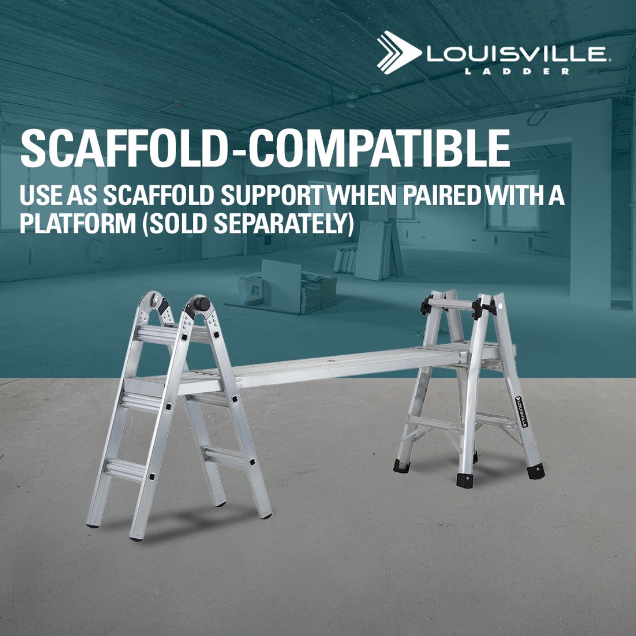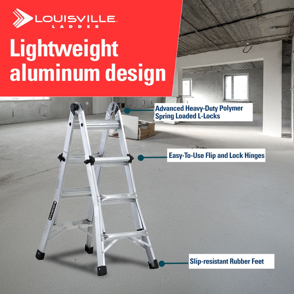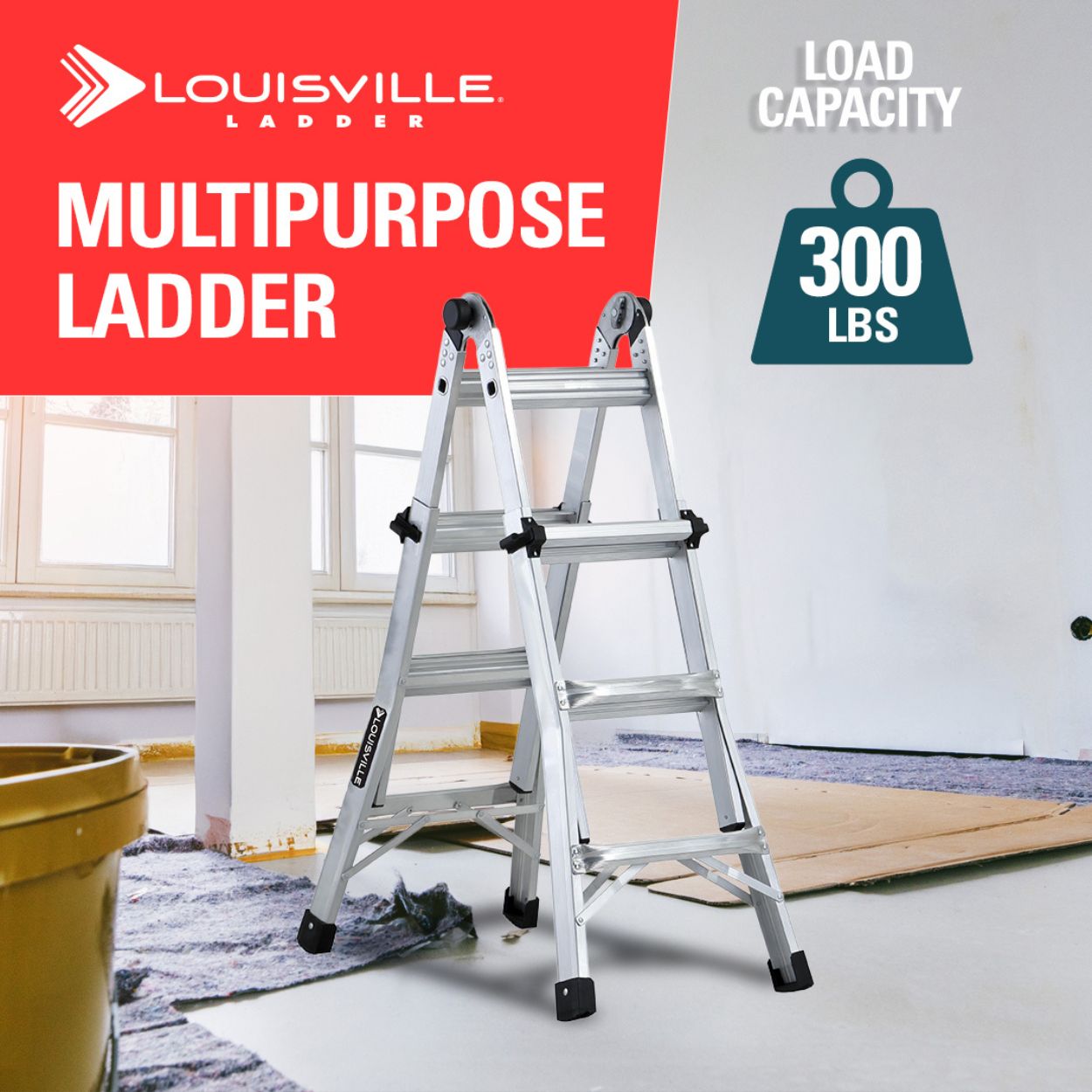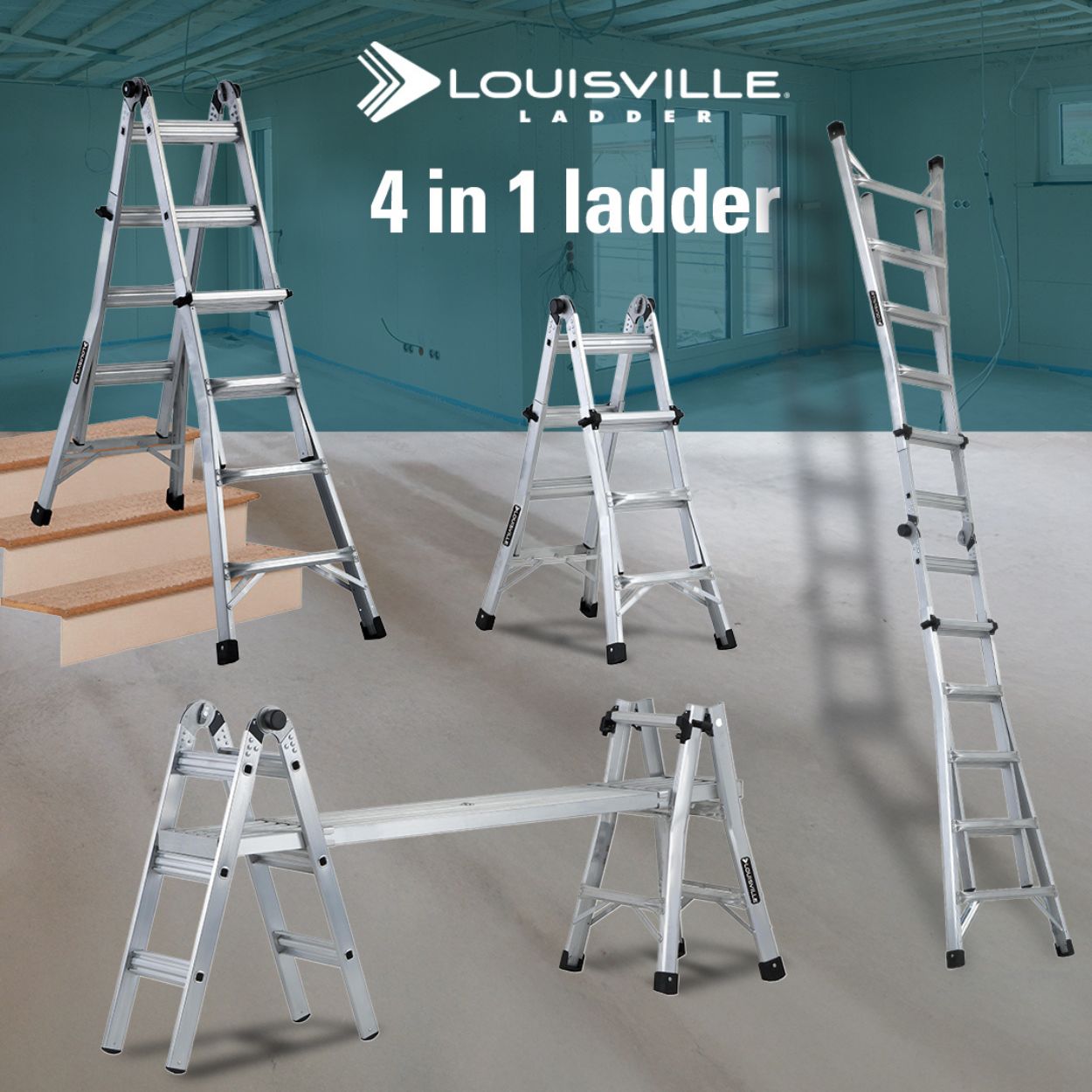 The Louisville Ladder L-2098-13 Multipurpose Aluminum Ladder is built for versatility and strength. With its 4-in-1 design, it easily converts into a step ladder, extension ladder, stairway ladder, or scaffold support. Making it the perfect tool for contractors, painters, and DIYers who need reliable performance in one compact solution.Key Benefits